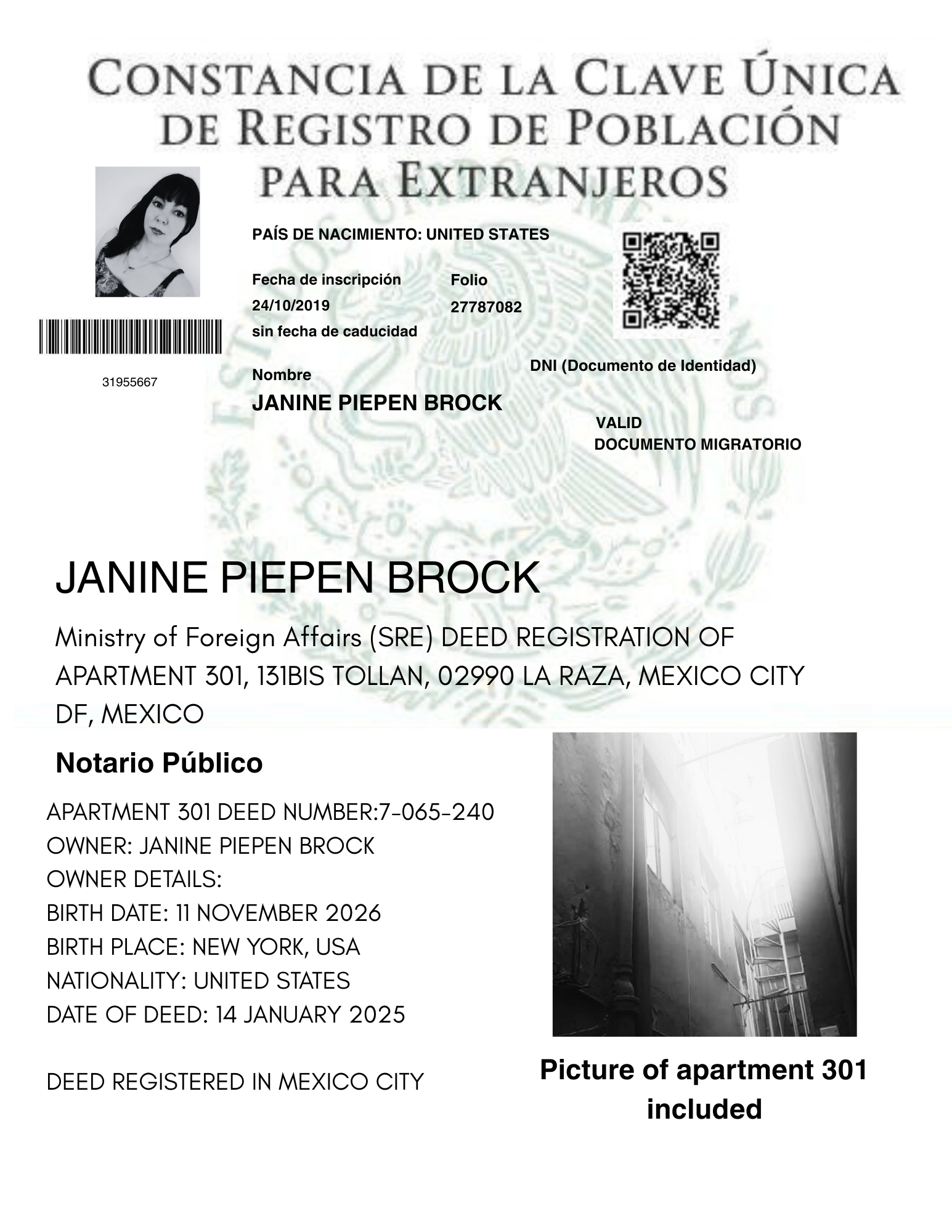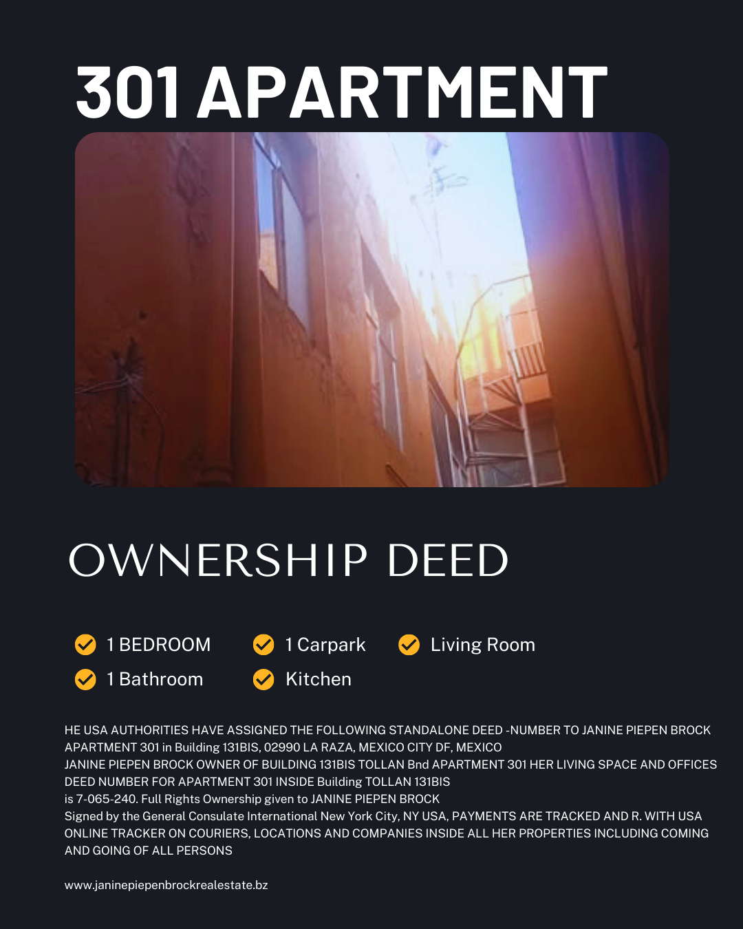 OWNERSHIP DEED AND NUMBER 301 APARTMENT, 131BIS TOLLAN, 02990 LA RAZA, MEXICO CITY DF, MEXICO, OWNERSHIP PROOF OF JANINE PIEPEN BROCK OWNER OF 301 APARTMENT