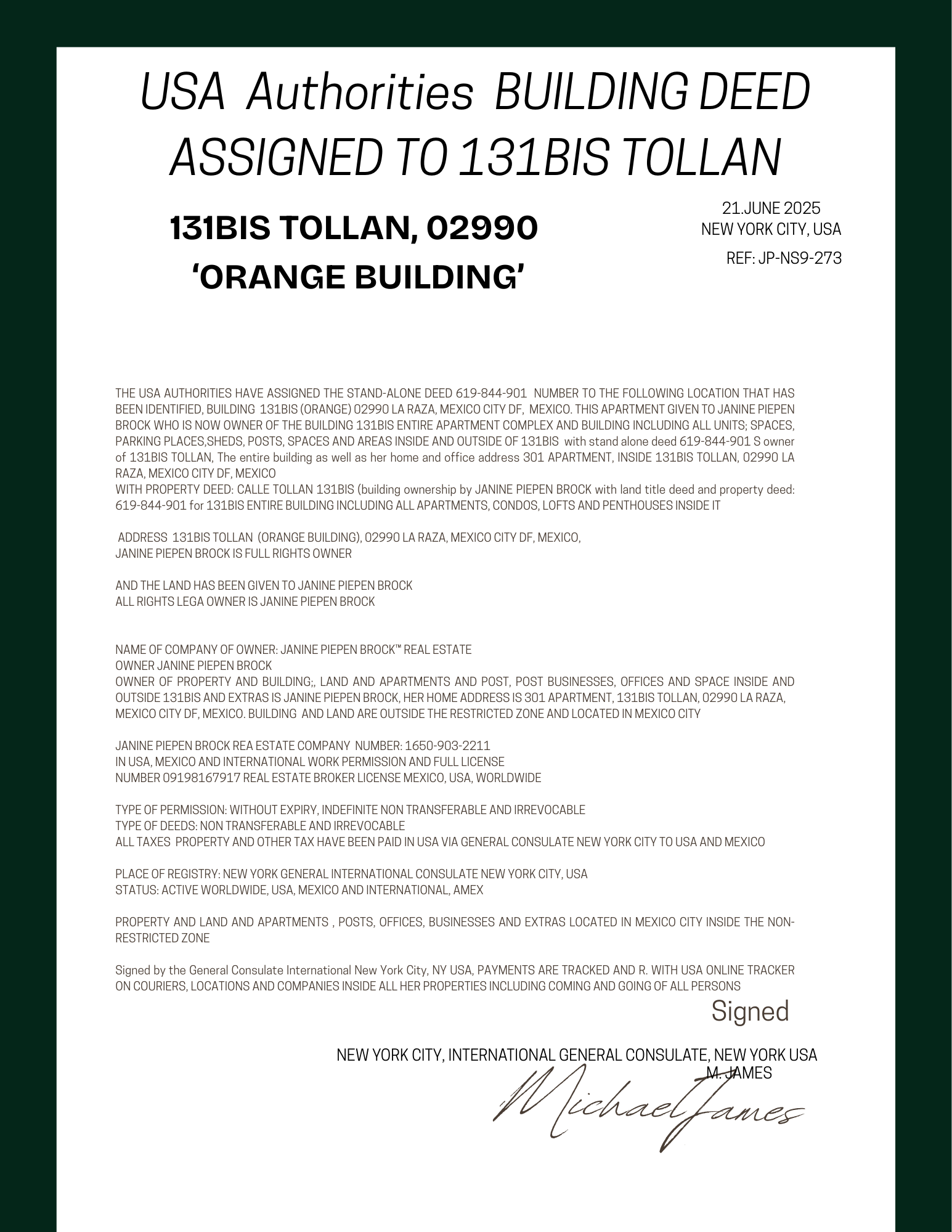 DEED USA, MEXICO AND WORLDWIDE SRE DEED 131BIS TOLLAN ORANGE BUILDING